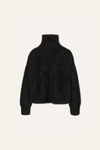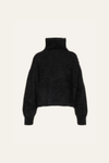Styling Notes: Embrace the cozy sophistication of the season with this oversized black cashmere sweater. Its texture and relaxed silhouette make it an effortlessly chic piece for layering over your favorite fall essentials. The high neckline adds a touch of warmth, perfect for pairing with sleek trousers or under statement coats during brisk autumn evenings.
