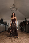Celeste — Pre-Fall ’26 evokes the equestrian spirit of Latin America through silhouettes that balance gaucho grit and escaramuza grace. Cape-kissed sleeves, elongated tunics, and fluid dresses echo the rhythm of riding, while florals and graphic motifs nod to traditional embroidery. Rich, earthy tones unfold across linens, silks, jacquards, and embroidered georgettes, complemented by sculpted belts, natural-fiber hats, confident boots, and the season’s signature bow. Celeste is crafted for women who embody strength, elegance, and the quiet power of heritage.