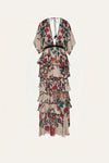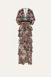 A maxi dress crafted in silk double georgette, featuring cascading tiers that create a layered silhouette. The botanical print unfolds in rich tones over an ecru base, adding depth and contrast. Designed for statement moments, it’s best styled with minimal accessories to let the print and volume take center stage.