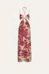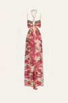 Silk maxi dress printed with the classic JO palm motif in pink tones. Designed with delicate shoulder straps, a front tie detail, and a cutout at the waist. The ankle-length silhouette creates a graceful, elongated line.