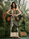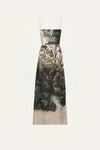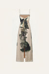A maxi dress crafted in linen, featuring a detailed landscape print in green tones over an ecru base. Designed with delicate straps and a clean, elongated silhouette that highlights the artwork of the fabric. A versatile piece for spring and warm-weather occasions, styled with flat sandals for daytime or simple accessories for a more elevated look.