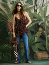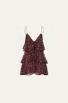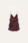 A mini dress crafted in mesh sequins, finished in a rich wine tone with antique silver accents. Designed with delicate straps and a tiered silhouette, it’s an effortless choice for evening events and nights out, styled simply to let the texture shine.