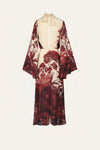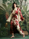 A silk double georgette gown featuring a Colombian landscape rendered in rich red tones over an ecru base. Designed with fluid sleeves and a softly draped neckline that ties at the back, it balances movement and structure with ease. The elongated silhouette allows the artwork to unfold gracefully, making it an elegant choice for spring evenings and special occasions where the print takes center stage.