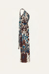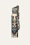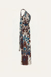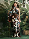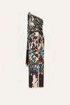 A maxi dress crafted in heavy crepe with an expressive botanical print. Designed with an asymmetrical neckline and a clean, elongated silhouette, it stands out as a refined statement piece. Ideal for evening occasions, styled with sculptural accessories from the collection.