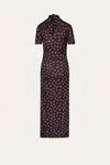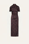 A midi dress crafted in shiny jersey with an expressive animal print. Designed with a high neckline, short sleeves, and a tie at the back, it drapes fluidly with ease and movement. Perfect for daytime occasions, styled with flat sandals or layered accessories.