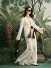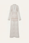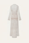 A tunic dress crafted in cotton eyelet, featuring an elongated silhouette and intricate openwork detailing. Designed with a front opening finished with hook-and-eye closures, it stands as a refined statement piece for daytime soirées.
