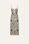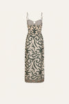 A midi-length linen dress designed for warm-weather soirées. Featuring slender straps, a ring detail at the bust, and subtle cutouts, it’s finished with intricate embroidery along the hem. The silhouette blends ease with sophistication, making it a standout for day-to-night dressing.