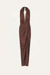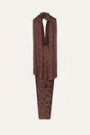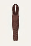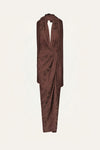 A halter-neck dress crafted in palm jacquard, offering rich texture and a refined sheen. Designed with a knotted front detail, a tie at the back, and a matching scarf, it features a fluid, versatile silhouette. Style it with minimal sandals for daytime occasions or pair it with statement jewelry for an elevated evening look.