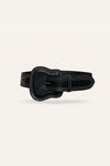 This wide leather belt features a sculptural buckle and contrast topstitching that highlights its bold, structured shape. Designed to define the waist with a touch of Western-inspired refinement, it adds texture and strength to both flowing silhouettes and tailored pieces. A signature accessory with enduring impact.