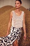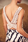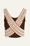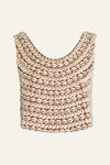 A sleeveless top showcasing hand-embroidered cowrie shells that trace the silhouette with sculptural elegance. Wide straps cross at the back in a refined V-shape, adding architectural interest.