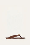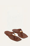 A leather sandal featuring a toe post and metal detail at the center. Designed for summer soirées and evening gatherings, styled with dresses or fluid silhouettes.