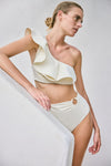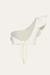 A striking one-shoulder bikini top in ecru, featuring a sculptural bolero-style design—a classic Johanna Ortiz style. This piece can be paired with its matching bikini bottom or styled with other prints from the collection for a versatile, mix-and-match look.