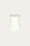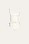A sleek one-piece swimsuit in ecru, crafted from recycled Lycra. The ruched design is complemented by a braided belt with shell detailing at the waist, adding a unique Johanna Ortiz touch.
