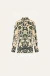 A silk CDC blouse featuring a botanical motif in soft green tones, designed with a gently gathered neckline and a tie at the back that forms a delicate knot detail. Fluid and lightweight, it offers an elegant drape and an effortless feel. Ideal for spring styling, it pairs seamlessly with the matching skirt or with tailored pants for a polished yet relaxed JO look.