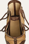 A mini tote bag crafted in cow leather, featuring a structured silhouette and artisanal detailing. Designed with an open top and button loop fastening, it offers practical ease while maintaining a refined finish. Compact and versatile, it is intended for effortless daytime wear, accompanying the modern explorer through each moment of her journey.