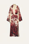 A silk double georgette gown featuring a Colombian landscape rendered in rich red tones over an ecru base. Designed with fluid sleeves and a softly draped neckline that ties at the back, it balances movement and structure with ease. The elongated silhouette allows the artwork to unfold gracefully, making it an elegant choice for spring evenings and special occasions where the print takes center stage.