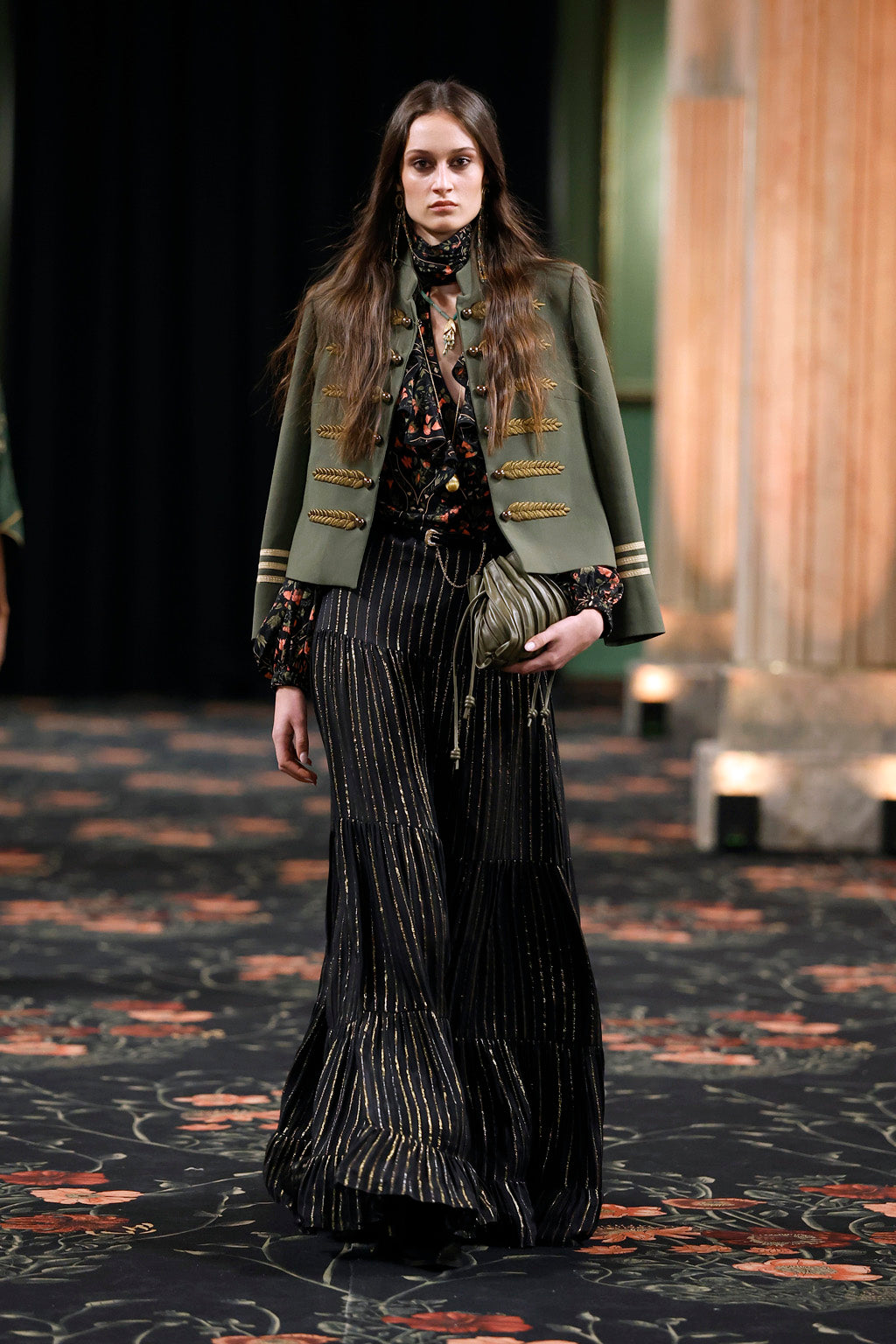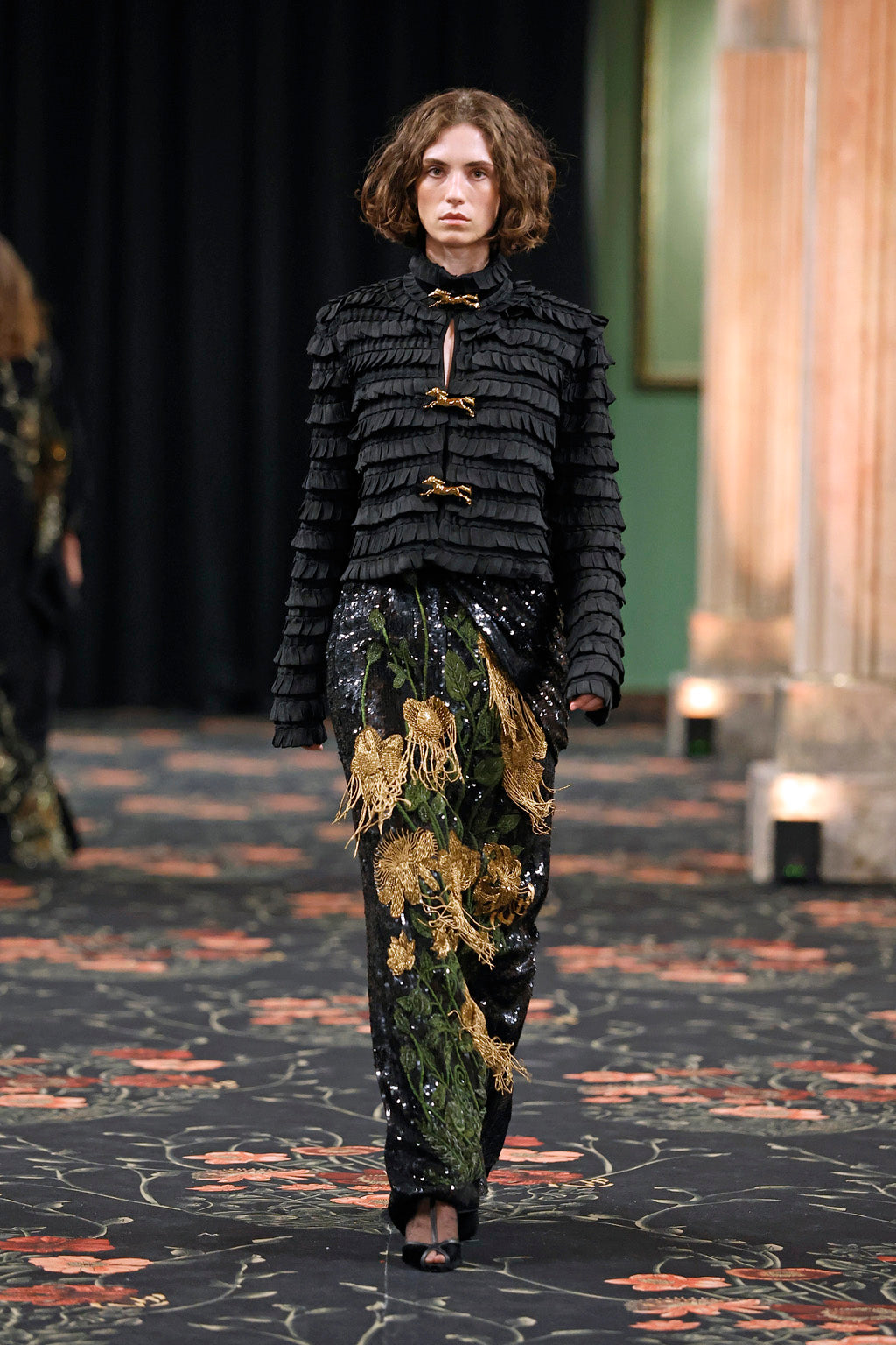 Movement and ease define the collection, built on fluid, elongated silhouettes layered with statement outerwear and versatile separates. Oversized shearling vests, reimagined pajama sets, romantic garden dresses, and soft-structured jackets bring a balance of volume and flow, while subtle torero-inspired details add character. This modular approach allows seamless transitions from day to evening, where outerwear stands out, separates feel collectible, and layering becomes a form of storytelling, enriched by the warmth and movement of feathers.