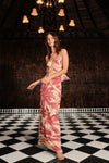 Silk maxi dress printed with the classic JO palm motif in pink tones. Designed with delicate shoulder straps, a front tie detail, and a cutout at the waist. The ankle-length silhouette creates a graceful, elongated line.