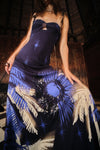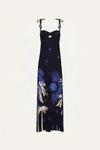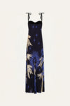 Maxi dress in heavy crepe featuring an embroidered sun and palm design. Detailed with knotted straps, a small front cutout, and a structured silhouette that falls to the floor with natural volume.
