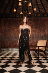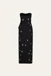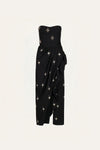 Ankle-length dress in embroidered cotton jacquard embellished with star embroidery. Designed with a strapless neckline, a structured bodice, and a draped skirt that opens softly at the front. A refined choice for evening occasions and special celebrations.