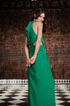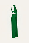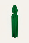 Maxi dress in crepe featuring side cutouts and gathered detailing at the waist. Designed with a high neckline and a fluid silhouette that falls elegantly to the floor. An effortless choice for evening events, destination dinners, or summer celebrations.