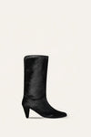 Crafted in 100% cow leather with a refined texture, these boots feature a pointed toe and a sleek mid-heel design. The slip-on silhouette and minimal detailing make them a timeless, versatile choice for both day and night looks.