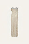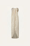 A strapless top crafted in palm jacquard in a soft ecru tone. The silhouette features a twisted knot detail at the bodice, creating gentle draping and visual interest through the front. Pair it with the matching pants for a coordinated JO look.