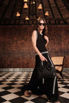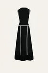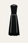 Sleeveless knit midi dress detailed with contrasting trims along the edges. Designed with a fitted silhouette and subtle fringe hem. Pair with the matching cardigan for a coordinated look.