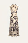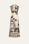 Midi dress in silk featuring a JO landscape motif. Designed with a keyhole neckline, short sleeves, and a fitted waist for a defined shape.