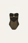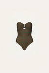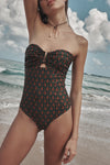 A one-piece swimsuit featuring a JO print, designed with a strapless neckline, ruched bust, and center hardware detail with a front cut-out. Perfect for sun-drenched days and beachside escapes. Style it with a pareo or worn under a lightweight layer.