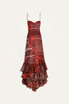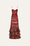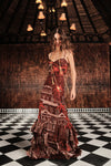 An elegant strapless gown crafted from silk lurex crêpe, featuring one of Johanna Ortiz’s signature architectural prints. The fluid silhouette and tiered ruffle hem create a sense of refined movement, making it an exquisite choice for formal dinners or special evening occasions.