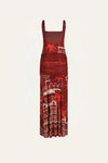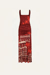 An ankle-length dress crafted in shiny jersey, featuring one of Johanna Ortiz’s signature architectural prints. The gathered waistline and fluid drape create a flattering silhouette that moves beautifully—perfect for daytime gatherings that transition effortlessly into evening moments.