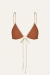 A triangle bikini top in crinkle Lycra, in mocca and ecru. Defined by contrast trim and adjustable ties, it offers a sleek and modern take on a timeless silhouette. Pair with the matching bikini bottom for a coordinated look.