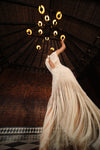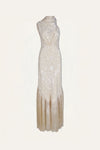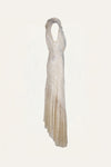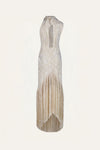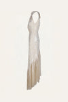 An elegant halter dress crafted in embroidered silk fabric, designed with a fluid drape that moves beautifully. Finished with long fringes at the hem, it captures a sense of refined ease and timeless sophistication—perfect for evening occasions or special celebrations.