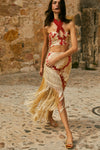 Our Sevillian rhythm ankle skirt is inspired by the flamenco spirit. Featuring macrame fringe and embroidered patterns, this piece is designed for dancing freely.