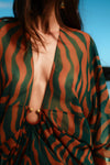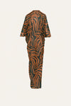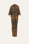 A flowing caftan cut in eco georgette, defined by its plunging neckline with a ring detail and fluid drape. The bold JO print enhances its statement appeal, making it an effortless layer over swimwear or styled solo for summer evenings.