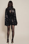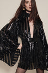 A sequin-embellished piece with an open neckline and flared sleeves. Wear as a mini dress or layer over the matching pants for a directional look. Ideal for evening with statement jewelry or styled as a set.