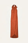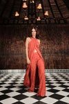 A halter top crafted from textured jacquard featuring a subtle palm motif. Designed to drape fluidly, it pairs beautifully with the matching pants for a coordinated look or with denim for an effortless ensemble.