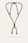 A necklace defined by its artisanal leather cord, where a zamak pendant brings a quiet, expressive presence.