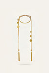 Hand-molded using traditional goldsmithing techniques, this wrap-around necklace features coin-inspired details and tassel ends. Its versatile design allows it to be styled long, layered, or tied for a refined yet effortless statement.
