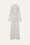 A tunic dress crafted in cotton eyelet, featuring an elongated silhouette and intricate openwork detailing. Designed with a front opening finished with hook-and-eye closures, it stands as a refined statement piece for daytime soirées.
