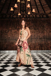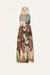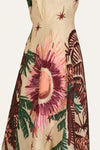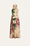A halter dress crafted from embroidered linen, featuring an open back and a vibrant hand-drawn botanical motif. Its fluid shape and ankle-grazing length make it an effortlessly versatile piece for both day and evening wear.